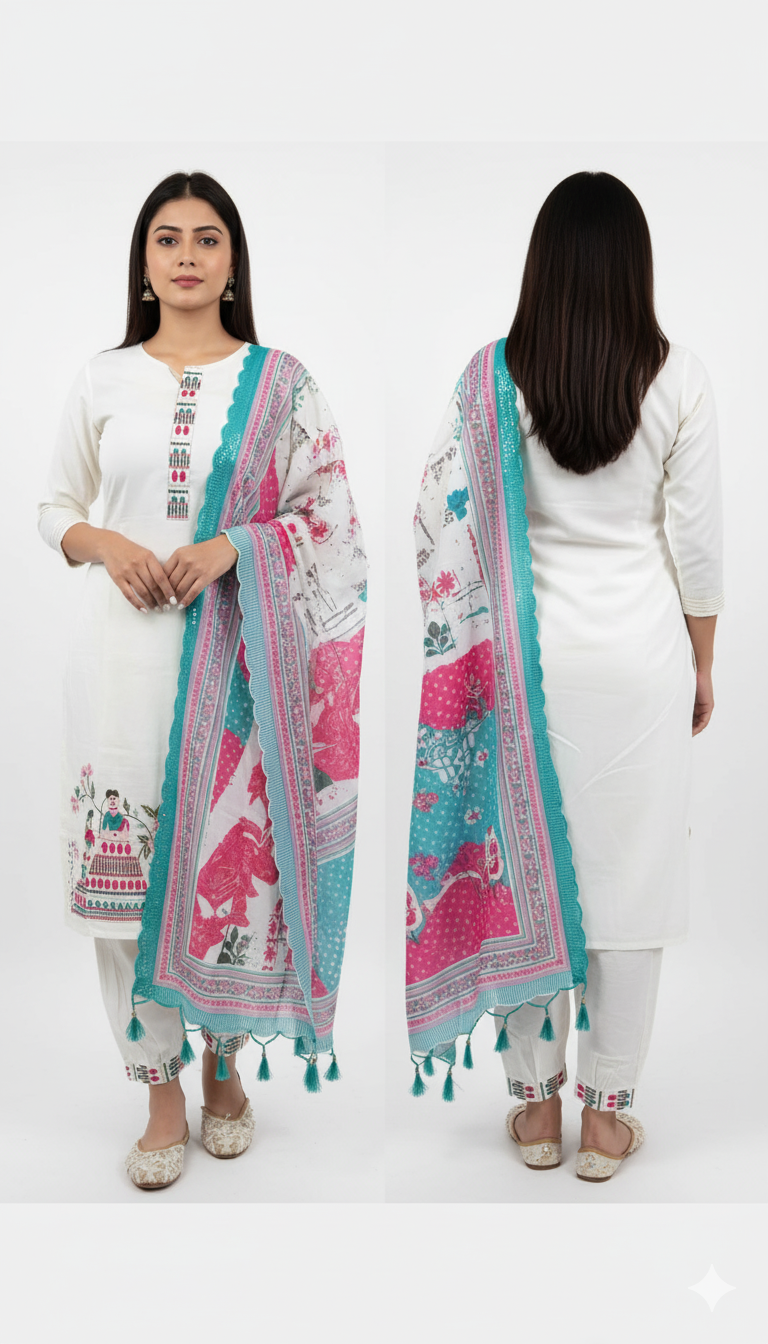 Complete Three-Piece Set – Kurta, trousers, and dupatta for ready-to-wear convenience.
