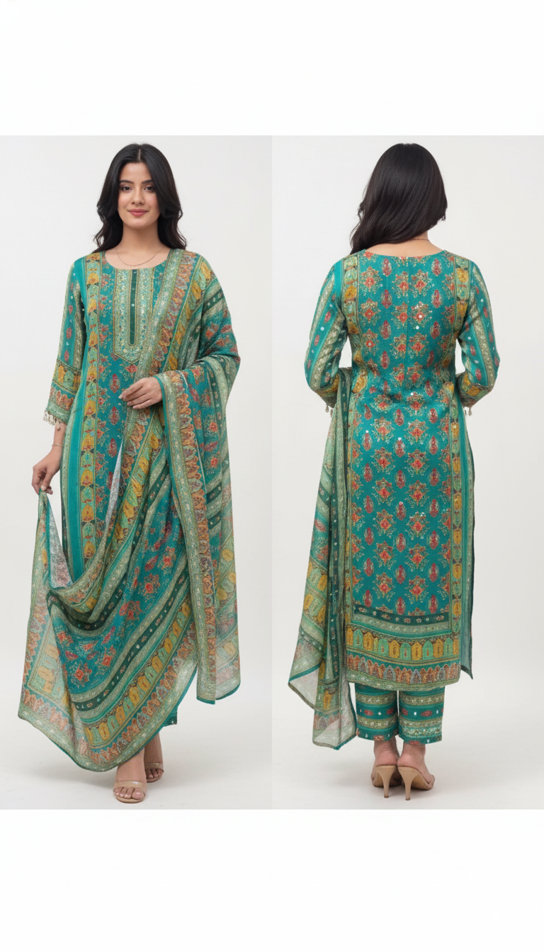 This beautiful straight kurta suit set includes a stylish floral printed kurta, a matching pant or palazzo, and optionally a coordinated dupatta, depending on the variation. The design highlights India’s rich textile tradition while maintaining a modern, minimalistic appeal. With its lightweight texture, breathable fabric, and elegant silhouette, this outfit is perfect for daily wear and semi-formal occasions alike.